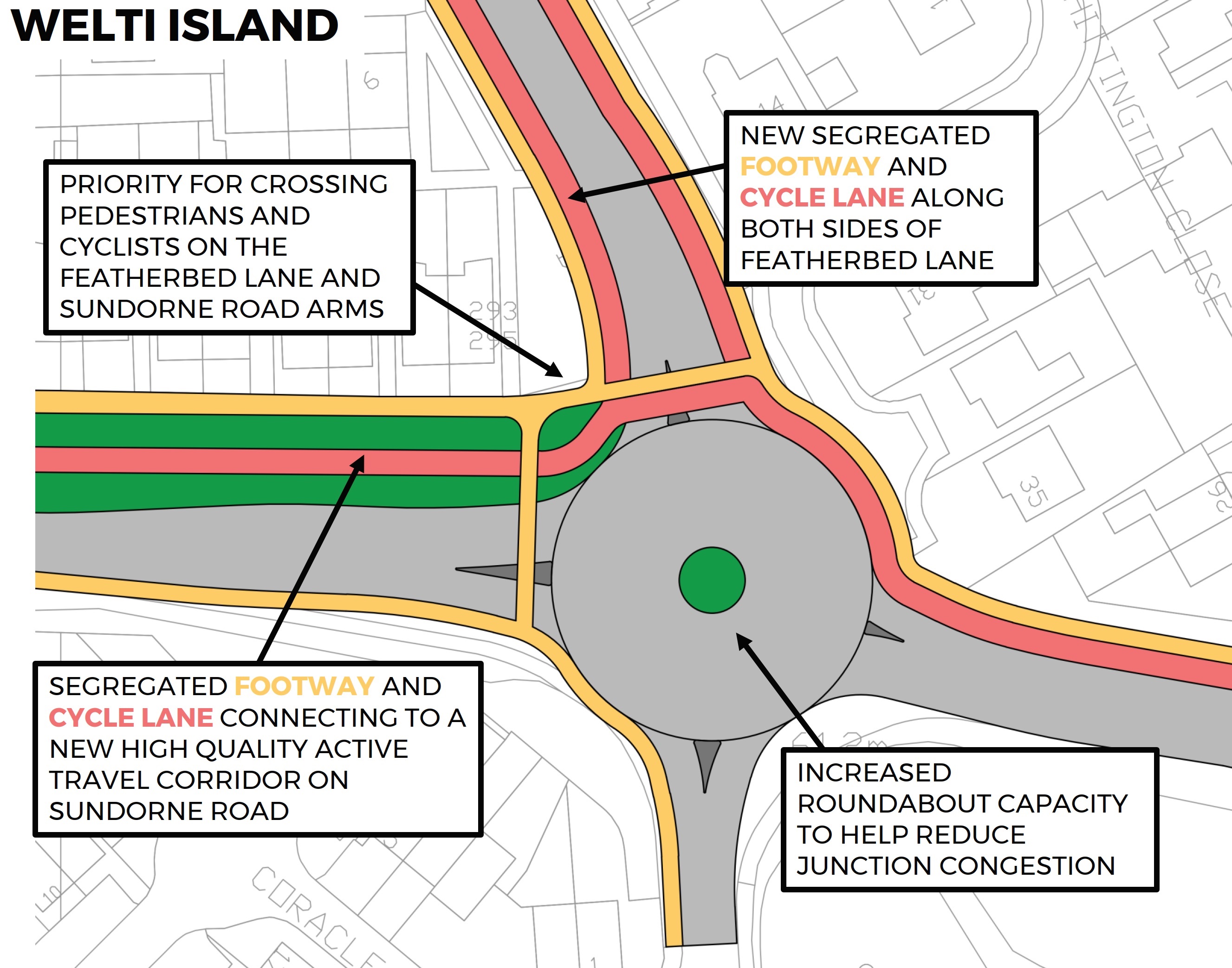 Whitchurch Road, Featherbed Lane and Sundorne Road are key routes in the area for all modes of travel. However, there is a need to redesign and upgrade these corridors to enhance the quality and safety of the walking and cycling facilities, reduce traffic domination and create more usable public spaces. This scheme would deliver improvements along these corridors which would support safer and more attractive active travel movements. Elements of design that would be delivered include segregated cycle lanes, widened footways and increasing numbers of safe pedestrian and cyclist crossing points.