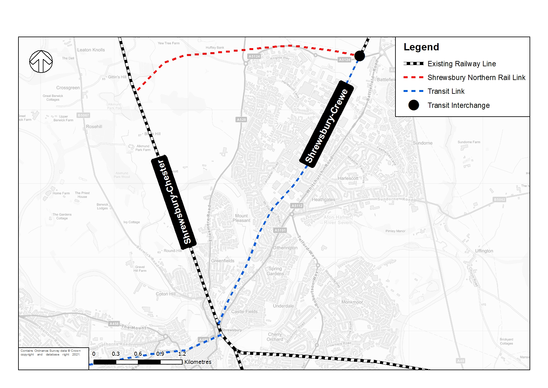 Delivering a new transit system in northeast Shrewsbury would provide a convenient and reliable public transport service that would significantly improve public transport connectivity to Shrewsbury town centre and wider strategic locations. This scheme would deliver a new rail link between the Shrewsbury-Crewe line and Shrewsbury-Chester rail lines, removing heavy rail from the heart of northeast Shrewsbury and diverting services from the Shrewsbury-Crewe line onto the Shrewsbury-Chester line. Delivering this new rail link would then allow the existing railway line through northeast Shrewsbury to be redeveloped into a rapid public transport corridor, extending through the town centre and out to the west of the town towards the hospital.