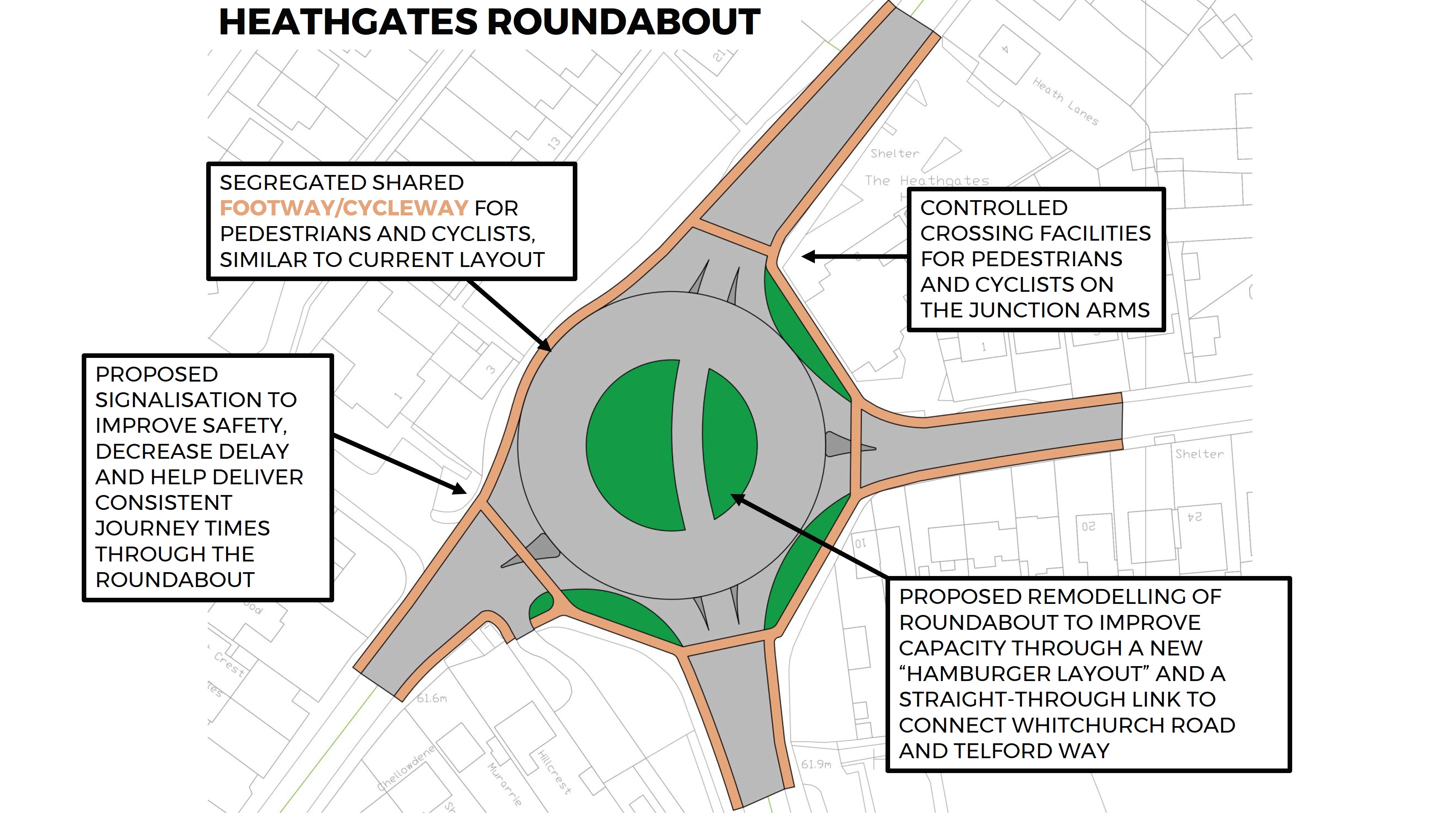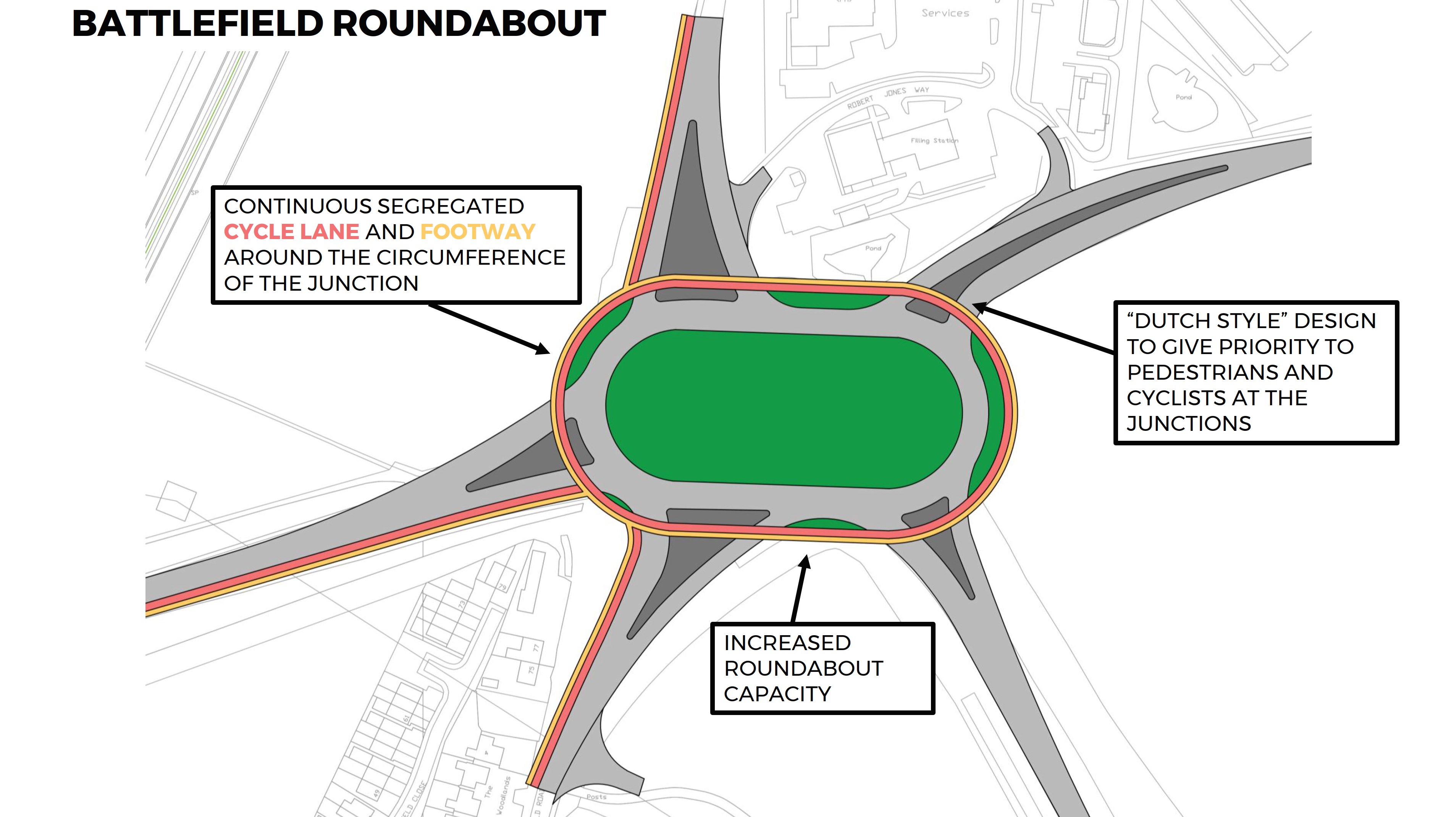 Significant junction improvements are proposed at several key junctions across this area of Shrewsbury to improve junction safety and capacity, and to deliver improved ease of navigability for those travelling on foot and by bicycle. The improvements are proposed at the following locations: