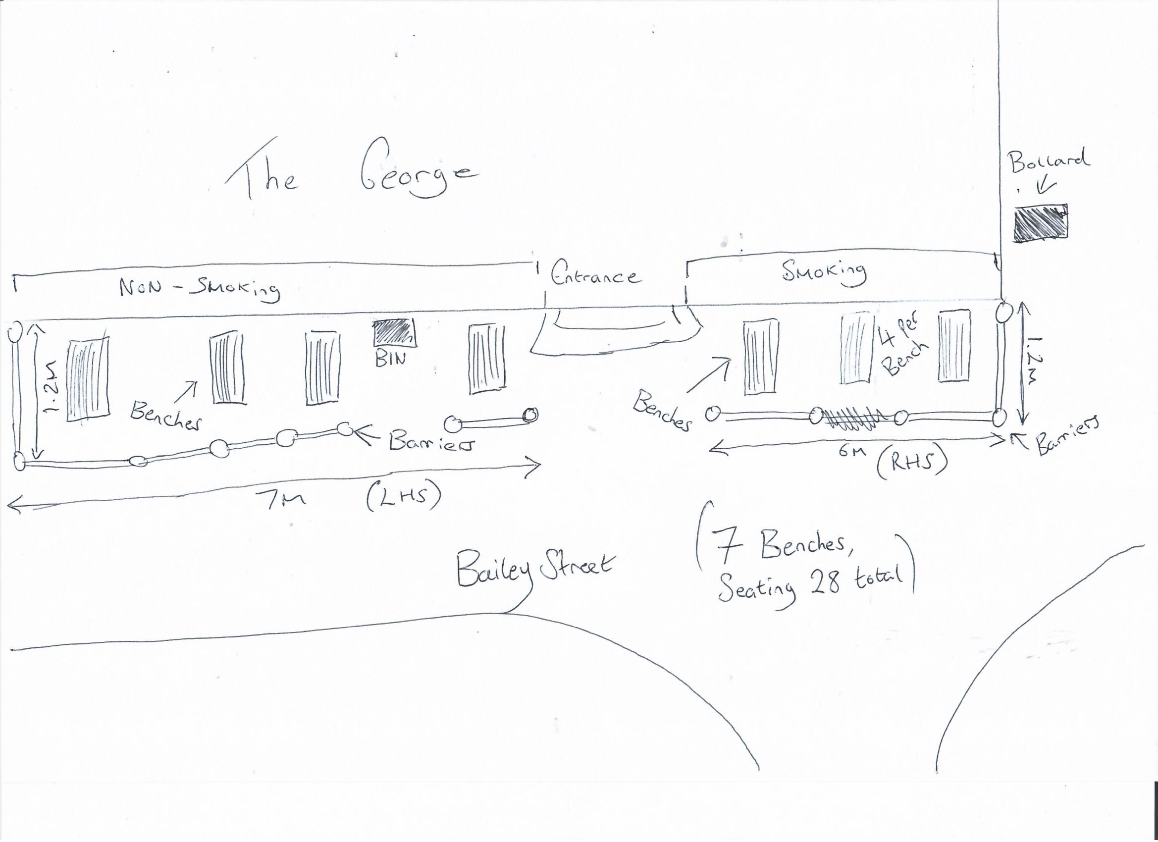Areas alongside the front of the building on Bailey Street either side of the main entrance 7m (L) x 1.2m (W) (LHS) and 6m (L) x 1.2m (W) (RHS up to the bollard) containing tables and chairs.