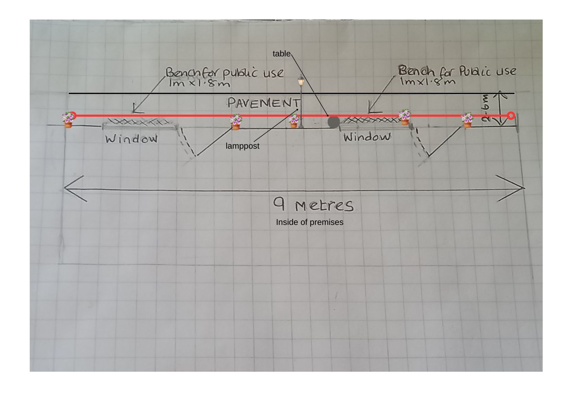 An area 9m x 1m containing benches and tables.