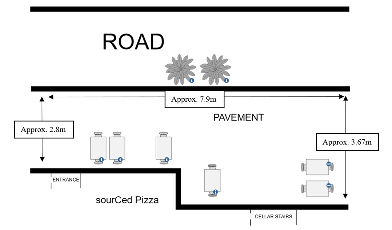 An area 6.3m (L) x 1.9m (W) narrowing to 1.7m (W) by the premises main window, containing tables and chairs.