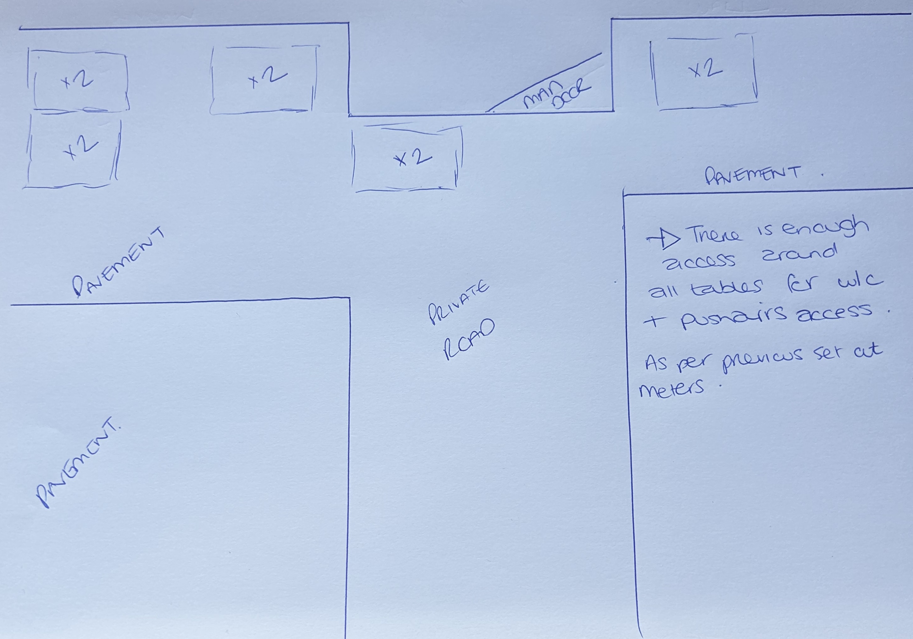 An area 7.5m (L) x 1.9m (W) in front of the left most window, narrowing to .90m (W) at the right-hand corner of the premises. The designated non-smoking table will be on the left as you come out of the door.